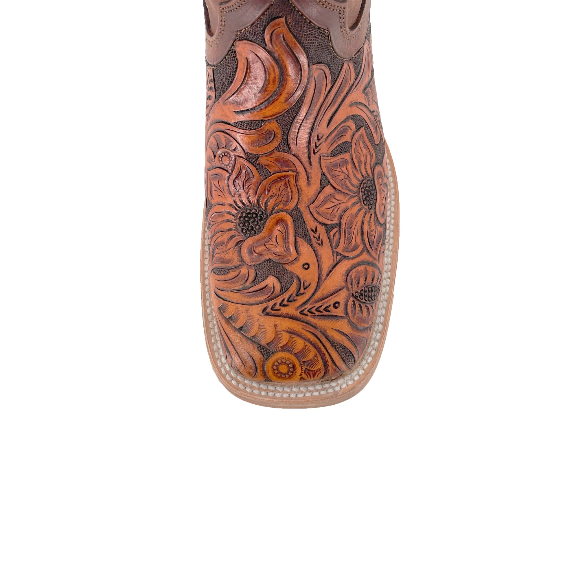 These handmade men's boots featuring handtooled leather and a square toe offer a classic western style. The Bulldog Hand Tooled Boots- Brown Bitone are a stylish and durable addition to any wardrobe.